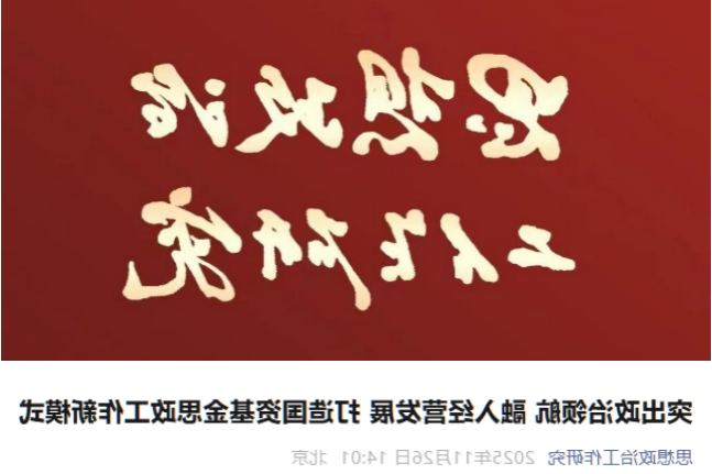 𒀰11月26日,《思想政治工作研究》微信公众号发布《突出政治领航 融入经营发展 打造国资基金思政工作新模式》,报道国新基金突出政治领航,融入经营发展,探索形成“思政工作引领投资方向、思政工作强化投后赋能、思政工作锻造投资铁军”的国资基金思政工作新模式。现将全文分享如下: